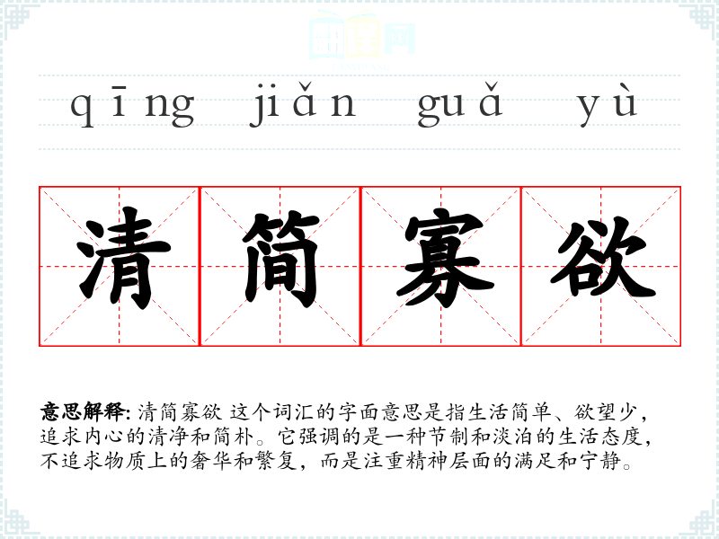 清简寡欲 这个词汇的字面意思是指生活简单、欲望少,追求内心的清净和简朴。它强调的是一种节制和淡泊的生活态度,不追求物质上的奢华和繁复,而是注重精神层面的满足和宁静。