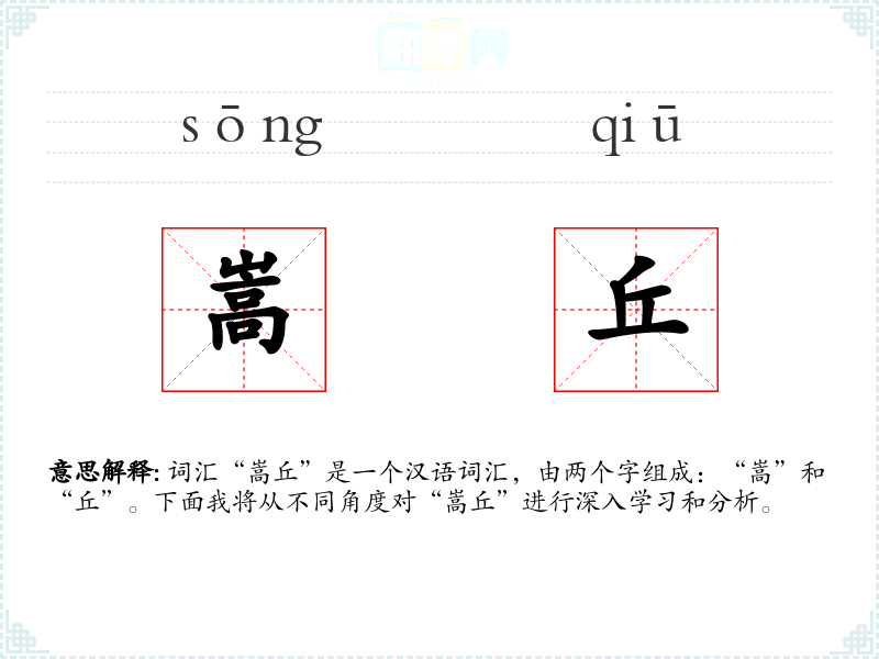 - 字面意思:“嵩”通常指高山,尤其是指河南省的嵩山,是五岳之一。“丘”指小山或土堆。