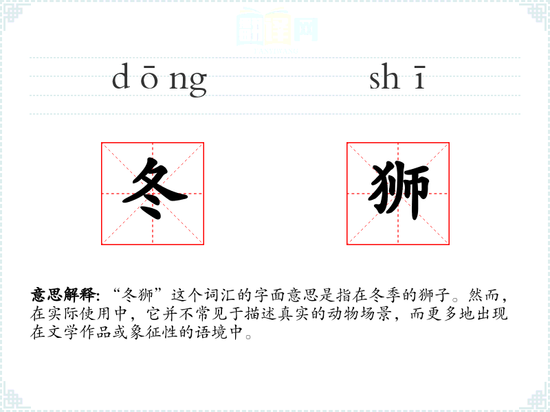 “冬狮”这个词汇的字面意思是指在冬季的狮子。然而,在实际使用中,它并不常见于描述真实的动物场景,而更多地出现在文学作品或象征性的语境中。
