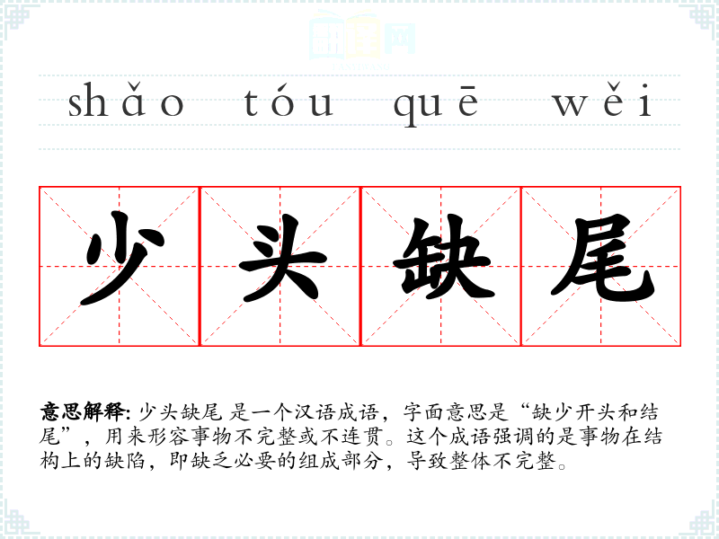 少头缺尾 是一个汉语成语,字面意思是“缺少开头和结尾”,用来形容事物不完整或不连贯。这个成语强调的是事物在结构上的缺陷,即缺乏必要的组成部分,导致整体不完整。