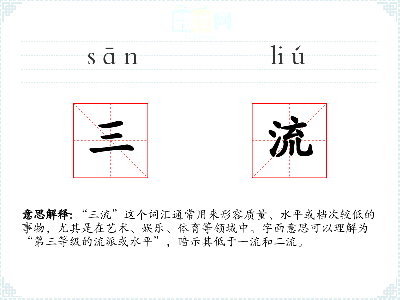 “三流”这个词汇通常用来形容质量、水平或档次较低的事物,尤其是在艺术、娱乐、体育等领域中。字面意思可以理解为“第三等级的流派或水平”,暗示其低于一流和二流。