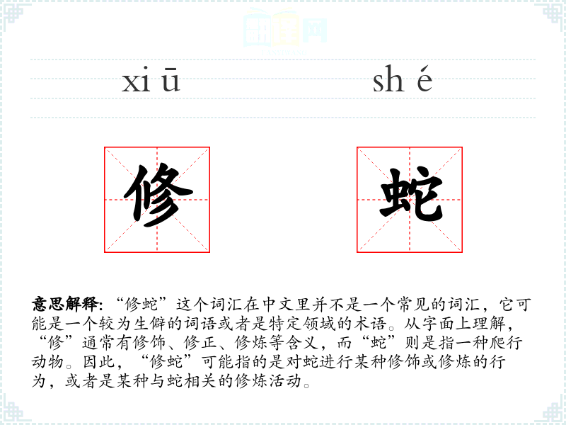 “修蛇”这个词汇在中文里并不是一个常见的词汇,它可能是一个较为生僻的词语或者是特定领域的术语。从字面上理解,“修”通常有修饰、修正、修炼等含义,而“蛇”则是指一种爬行动物。因此,“修蛇”可能指的是对蛇进行某种修饰或修炼的行为,或者是某种与蛇相关的修炼活动。