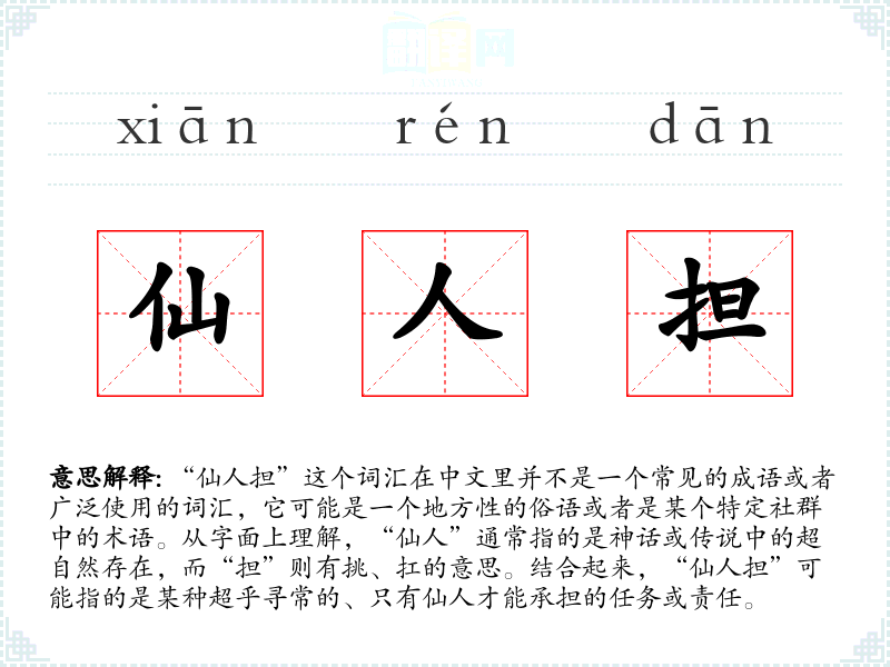 “仙人担”这个词可能会给人带来一种神秘和超自然的感觉,同时也可能让人联想到责任重大和挑战艰巨的情感。