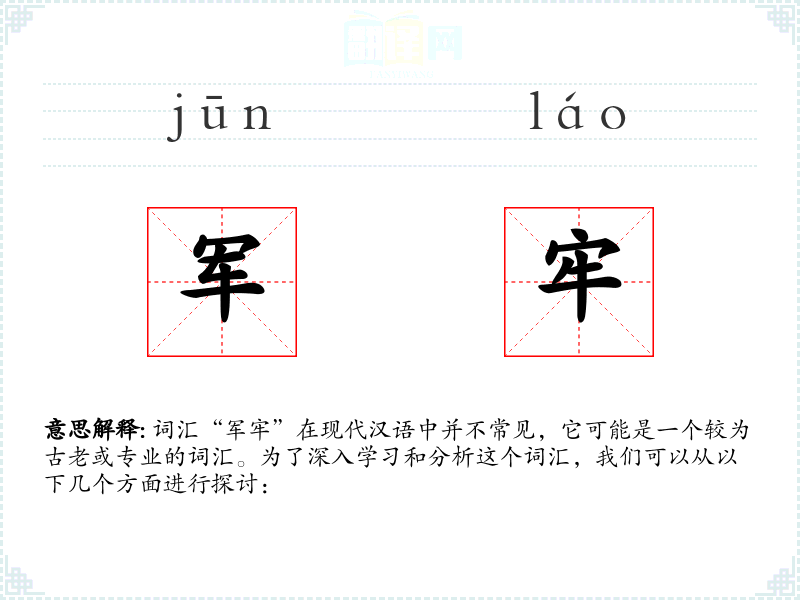 词汇“军牢”在现代汉语中并不常见,它可能是一个较为古老或专业的词汇。为了深入学习和分析这个词汇,我们可以从以下几个方面进行探讨: