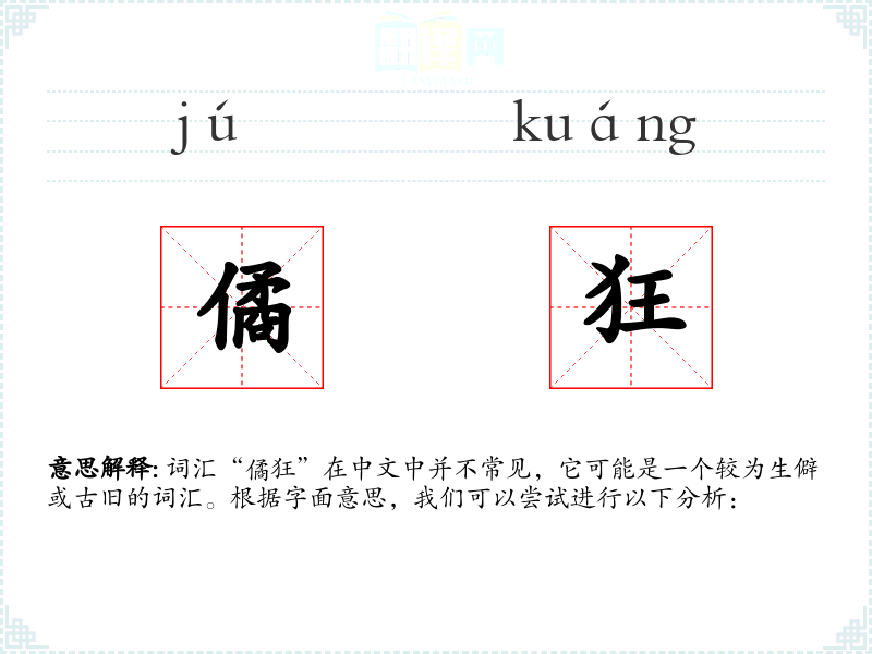 词汇“僪狂”在中文中并不常见,它可能是一个较为生僻或古旧的词汇。根据字面意思,我们可以尝试进行以下分析: