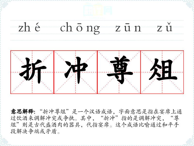 “折冲尊俎”是一个汉语成语,字面意思是指在宴席上通过饮酒来调解冲突或争执。其中,“折冲”指的是调解冲突,“尊俎”则是古代盛酒肉的器具,代指宴席。这个成语比喻通过和平手段解决争端或矛盾。