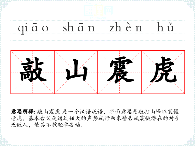敲山震虎 是一个汉语成语,字面意思是敲打山峰以震慑**。基本含义是通过强大的声势或行动来警告或震慑潜在的对手或敌人,使其不敢轻举妄动。