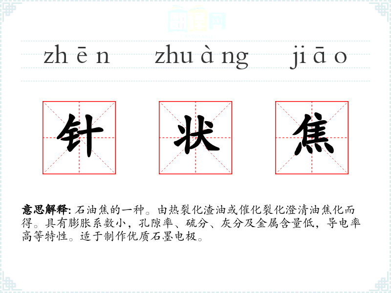 石油焦的一种。由热裂化渣油或催化裂化澄清油焦化而得。具有膨胀系数小,孔隙率、硫分、灰分及金属含量低,导电率高等特性。适于制作优质石墨电极。