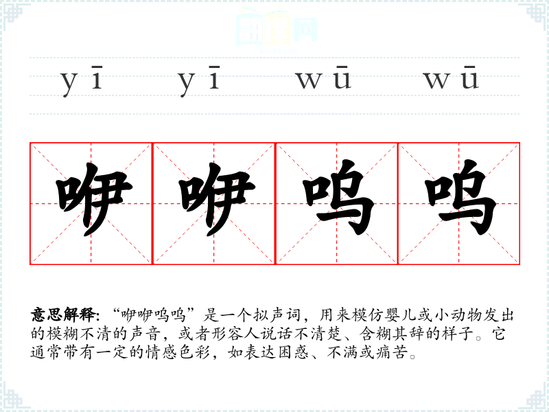 “咿咿呜呜”是一个拟声词,用来模仿婴儿或小动物发出的模糊不清的声音,或者形容人说话不清楚、含糊其辞的样子。它通常带有一定的情感色彩,如表达困惑、不满或痛苦。
