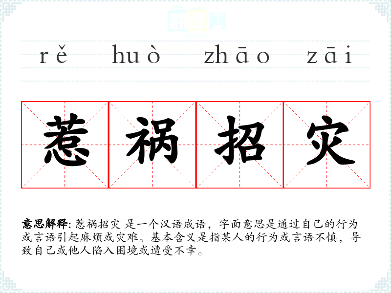 惹祸招灾 是一个汉语成语,字面意思是通过自己的行为或言语引起麻烦或灾难。基本含义是指某人的行为或言语不慎,导致自己或他人陷入困境或遭受不幸。