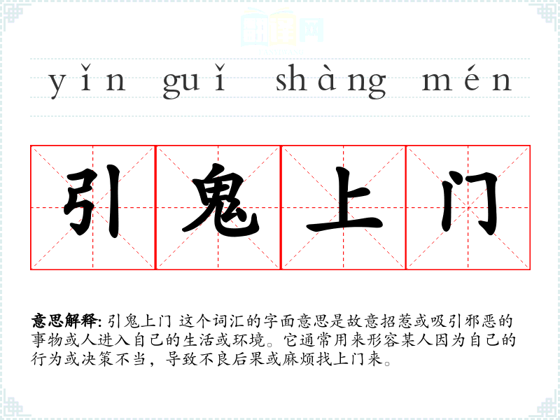 引鬼上门 这个词汇的字面意思是故意招惹或吸引邪恶的事物或人进入自己的生活或环境。它通常用来形容某人因为自己的行为或决策不当,导致不良后果或麻烦找上门来。