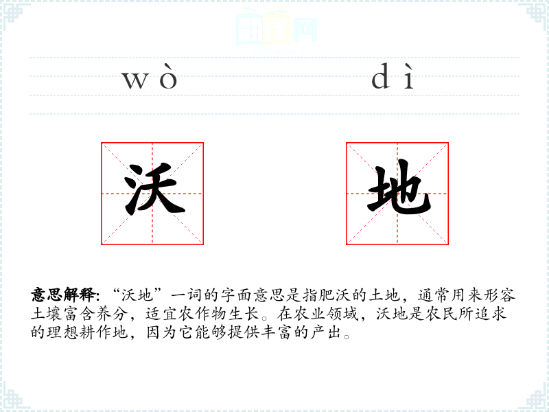 “沃地”一词的字面意思是指肥沃的土地,通常用来形容土壤富含养分,适宜农作物生长。在农业领域,沃地是农民所追求的理想耕作地,因为它能够提供丰富的产出。
