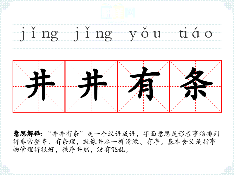 “井井有条”是一个汉语成语,字面意思是形容事物排列得非常整齐、有条理,就像井水一样清澈、有序。基本含义是指事物管理得很好,秩序井然,没有混乱。