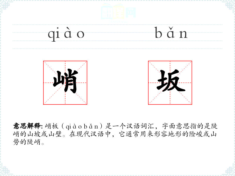 峭板(qiào bǎn)是一个汉语词汇,字面意思指的是陡峭的山坡或山壁。在现代汉语中,它通常用来形容地形的险峻或山势的陡峭。