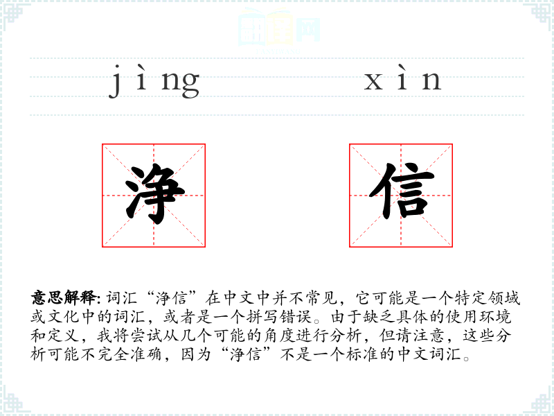 由于“浄信”不是一个标准的中文词汇,我们无法给出确切的基本定义。如果“浄”是“净”的误写,那么“净信”可能指的是纯净的信仰或信念。