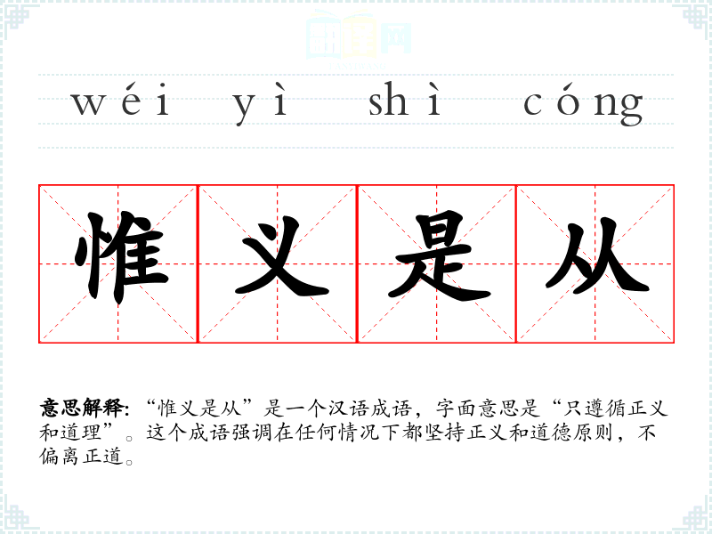 “惟义是从”是一个汉语成语,字面意思是“只遵循正义和道理”。这个成语强调在任何情况下都坚持正义和道德原则,不偏离正道。