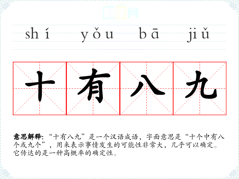 “十有**”是一个汉语成语,字面意思是“十个中有八个或九个”,用来表示事情发生的可能性非常大,几乎可以确定。它传达的是一种高概率的确定性。