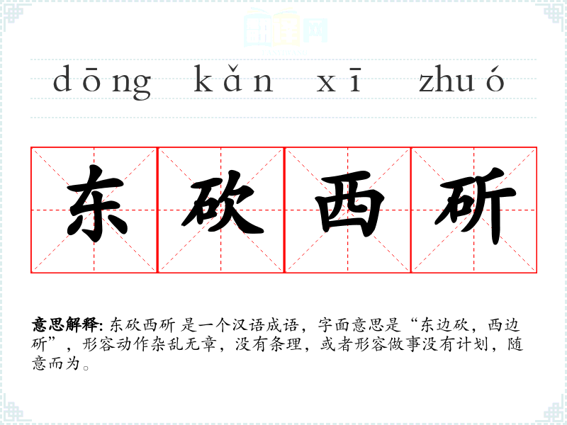 东砍西斫 是一个汉语成语,字面意思是“东边砍,西边斫”,形容动作杂乱无章,没有条理,或者形容做事没有计划,随意而为。