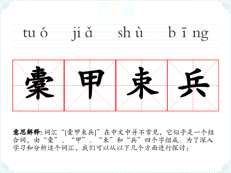 词汇“[橐甲束兵]”在中文中并不常见,它似乎是一个组合词,由“橐”、“甲”、“束”和“兵”四个字组成。为了深入学*和分析这个词汇,我们可以从以下几个方面进行探讨: