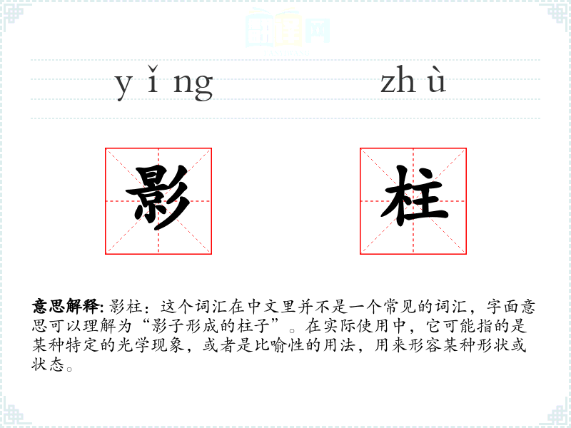 影柱:这个词汇在中文里并不是一个常见的词汇,字面意思可以理解为“影子形成的柱子”。在实际使用中,它可能指的是某种特定的光学现象,或者是比喻性的用法,用来形容某种形状或状态。