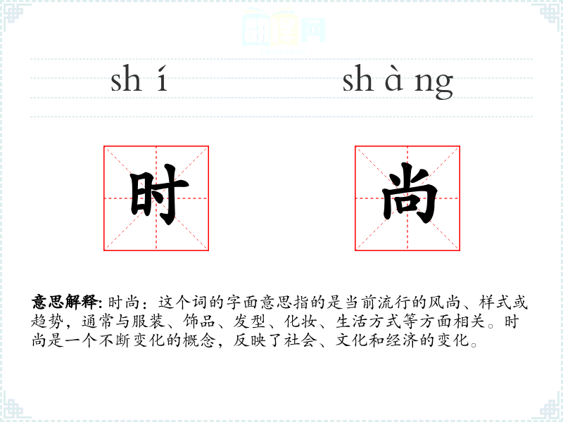 时尚:这个词的字面意思指的是当前流行的风尚、样式或趋势,通常与服装、饰品、发型、化妆、生活方式等方面相关。时尚是一个不断变化的概念,反映了社会、文化和经济的变化。