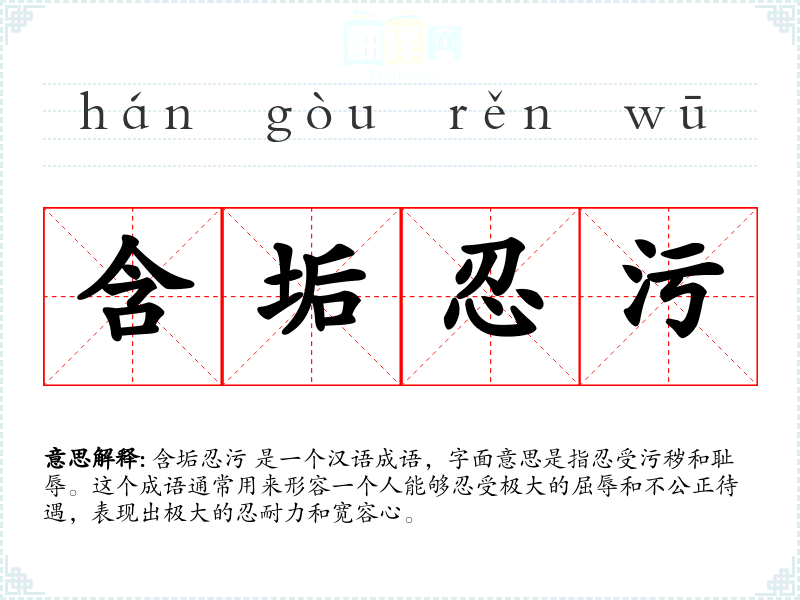 含垢忍污 是一个汉语成语,字面意思是指忍受污秽和耻辱。这个成语通常用来形容一个人能够忍受极大的屈辱和不公正待遇,表现出极大的忍耐力和宽容心。