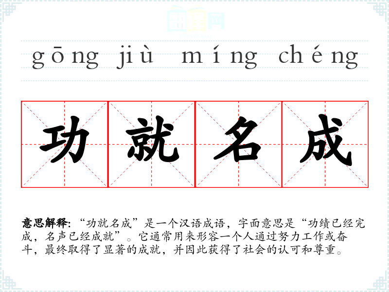 “功就名成”是一个汉语成语,字面意思是“功绩已经完成,名声已经成就”。它通常用来形容一个人通过努力工作或奋斗,最终取得了显著的成就,并因此获得了社会的认可和尊重。