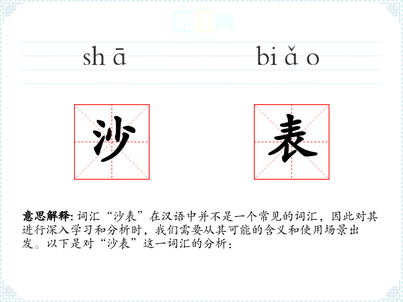 “沙表”字面意思可能是指用沙子制作的表或模型,或者是与沙子相关的某种表状物。在实际使用中,这个词汇可能并不常见,因此其基本含义可能需要结合具体语境来确定。