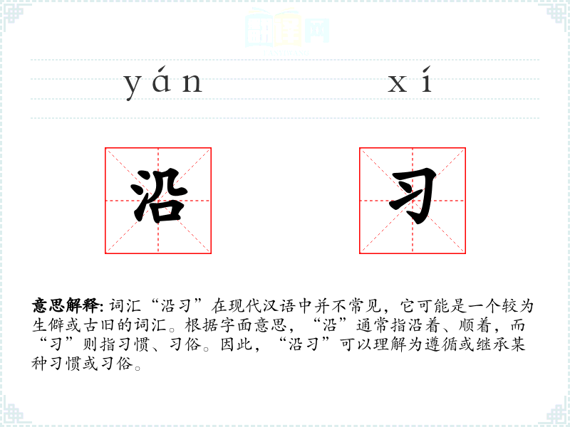 词汇“沿习”在现代汉语中并不常见,它可能是一个较为生僻或古旧的词汇。根据字面意思,“沿”通常指沿着、顺着,而“习”则指习惯、习俗。因此,“沿习”可以理解为遵循或继承某种习惯或习俗。