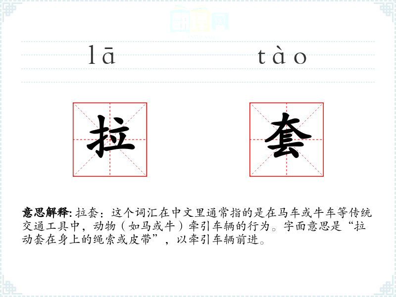 拉套:这个词汇在中文里通常指的是在马车或牛车等传统交通工具中,动物(如马或牛)牵引车辆的行为。字面意思是“拉动套在身上的绳索或皮带”,以牵引车辆前进。