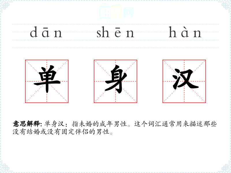 单身汉:指未婚的成年男性。这个词汇通常用来描述那些没有结婚或没有固定伴侣的男性。