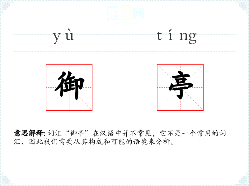 词汇“御亭”在汉语中并不常见,它不是一个常用的词汇,因此我们需要从其构成和可能的语境来分析。