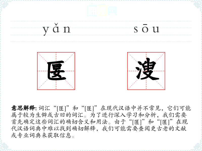 词汇“[匽]”和“[匽]”在现代汉语中并不常见,它们可能属于较为生僻或古旧的词汇。为了进行深入学习和分析,我们需要首先确定这些词汇的确切含义和用法。由于“[匽]”和“[匽]”在现代汉语词典中难以找到确切解释,我们可能需要查阅更古老的文献或专业词典来获取信息。