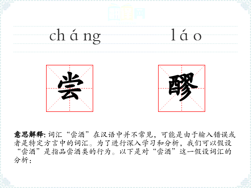 词汇“尝酒”在汉语中并不常见,可能是由于输入错误或者是特定方言中的词汇。为了进行深入学*和分析,我们可以假设“尝酒”是指品尝酒类的行为。以下是对“尝酒”这一假设词汇的分析: