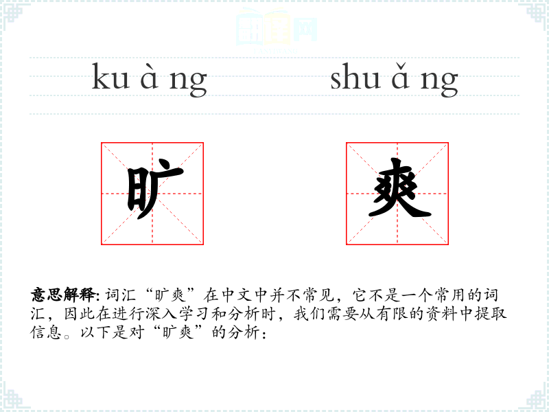 词汇“旷爽”在中文中并不常见,它不是一个常用的词汇,因此在进行深入学习和分析时,我们需要从有限的资料中提取信息。以下是对“旷爽”的分析: