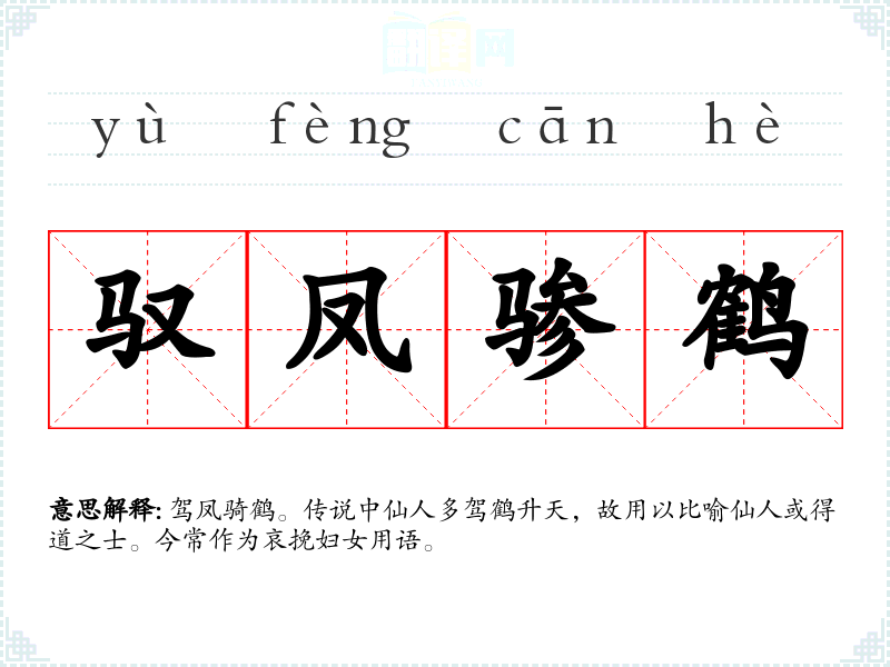 驾凤骑鹤。传说中仙人多驾鹤升天,故用以比喻仙人或得道之士。今常作为哀挽妇女用语。