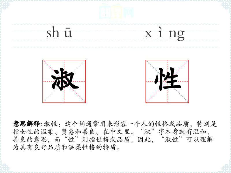 淑性:这个词通常用来形容一个人的性格或品质,特别是指女性的温柔、贤惠和善良。在中文里,“淑”字本身就有温和、善良的意思,而“性”则指性格或品质。因此,“淑性”可以理解为具有良好品质和温柔性格的特质。