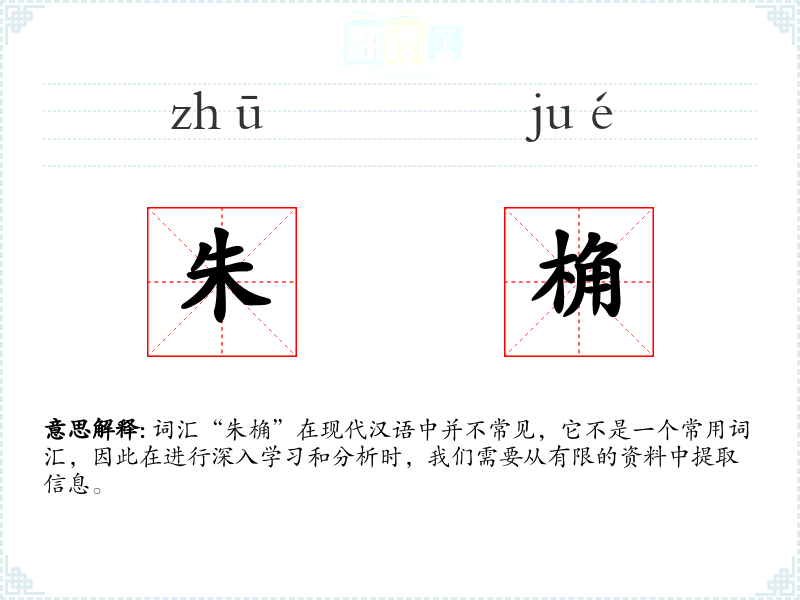 词汇“朱桷”在现代汉语中并不常见,它不是一个常用词汇,因此在进行深入学*和分析时,我们需要从有限的资料中提取信息。