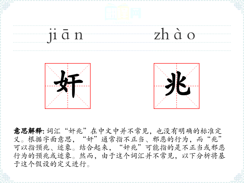词汇“奸兆”在中文中并不常见,也没有明确的标准定义。根据字面意思,“奸”通常指不正当、邪恶的行为,而“兆”可以指预兆、迹象。结合起来,“奸兆”可能指的是不正当或邪恶行为的预兆或迹象。然而,由于这个词汇并不常见,以下分析将基于这个假设的定义进行。