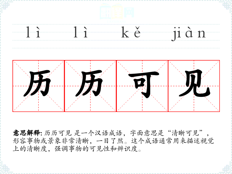 历历可见 是一个汉语成语,字面意思是“清晰可见”,形容事物或景象非常清晰,一目了然。这个成语通常用来描述视觉上的清晰度,强调事物的可见性和辨识度。