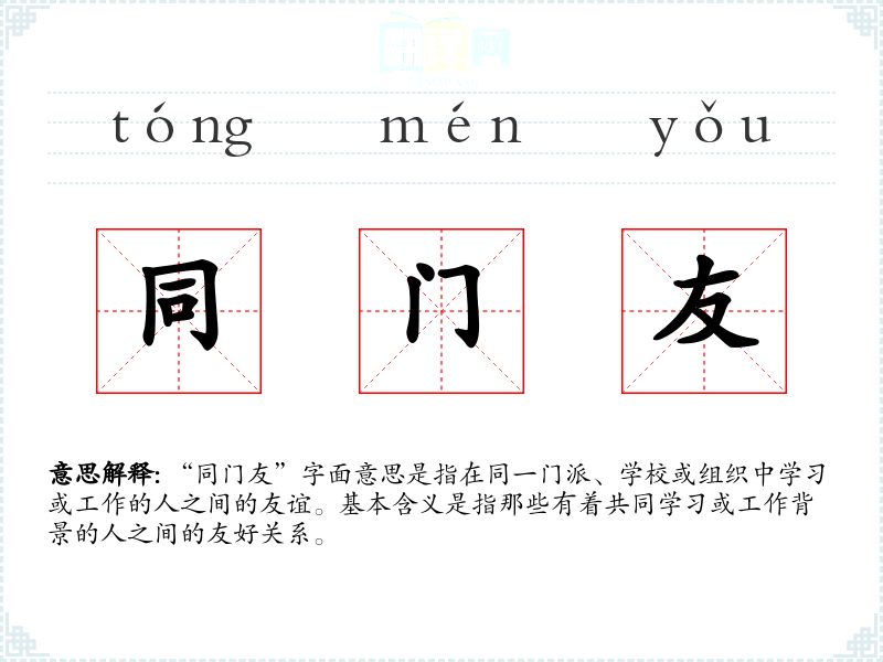 “同门友”字面意思是指在同一门派、学校或组织中学或工作的人之间的友谊。基本含义是指那些有着共同学或工作背景的人之间的友好关系。