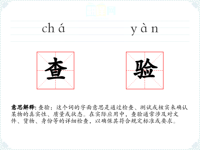 查验:这个词的字面意思是通过检查、测试或核实来确认某物的真实性、质量或状态。在实际应用中,查验通常涉及对文件、货物、身份等的详细检查,以确保其符合规定标准或要求。