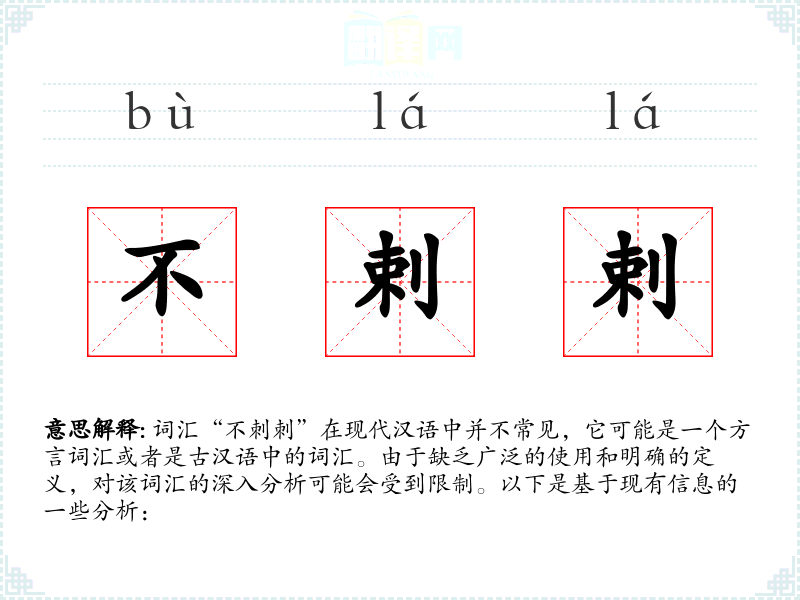 词汇“不刺刺”在现代汉语中并不常见,它可能是一个方言词汇或者是古汉语中的词汇。由于缺乏广泛的使用和明确的定义,对该词汇的深入分析可能会受到限制。以下是基于现有信息的一些分析: