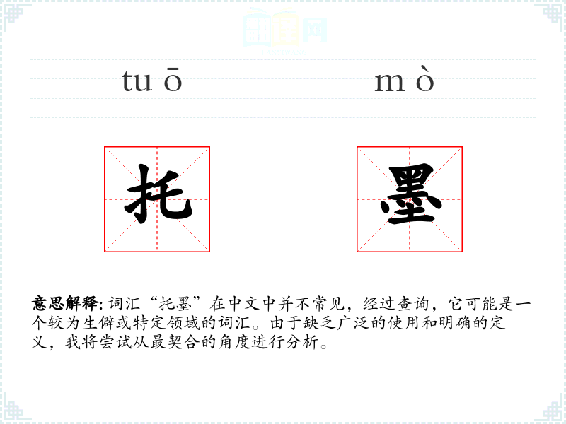 词汇“托墨”在中文中并不常见,经过查询,它可能是一个较为生僻或特定领域的词汇。由于缺乏广泛的使用和明确的定义,我将尝试从最契合的角度进行分析。