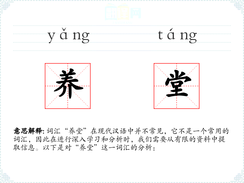 词汇“养堂”在现代汉语中并不常见,它不是一个常用的词汇,因此在进行深入学*和分析时,我们需要从有限的资料中提取信息。以下是对“养堂”这一词汇的分析: