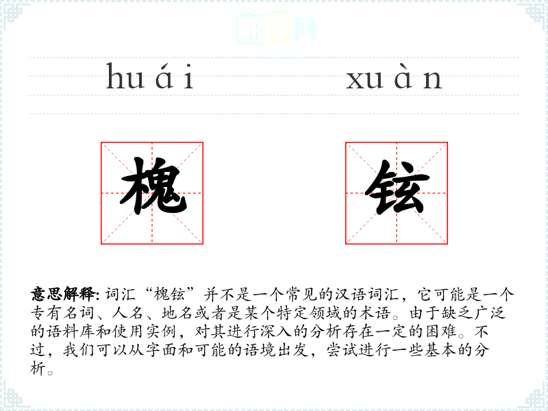 词汇“槐铉”并不是一个常见的汉语词汇,它可能是一个专有名词、人名、地名或者是某个特定领域的术语。由于缺乏广泛的语料库和使用实例,对其进行深入的分析存在一定的困难。不过,我们可以从字面和可能的语境出发,尝试进行一些基本的分析。