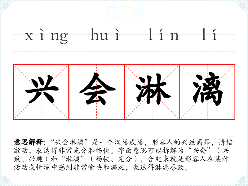 “兴会淋漓”是一个汉语成语,形容人的兴致高昂,情绪激动,表达得非常充分和畅快。字面意思可以拆解为“兴会”(兴致、兴趣)和“淋漓”(畅快、充分),合起来就是形容人在某种活动或情境中感到非常愉快和满足,表达得淋漓尽致。