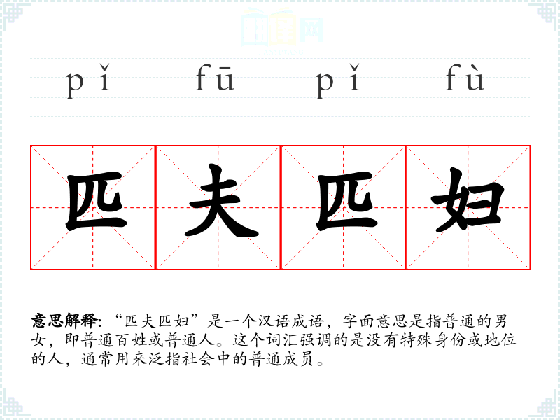 “匹夫匹妇”是一个汉语成语,字面意思是指普通的男女,即普通百姓或普通人。这个词汇强调的是没有特殊身份或地位的人,通常用来泛指社会中的普通成员。