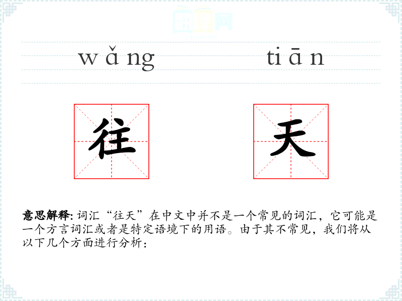 词汇“往天”在中文中并不是一个常见的词汇,它可能是一个方言词汇或者是特定语境下的用语。由于其不常见,我们将从以下几个方面进行分析: