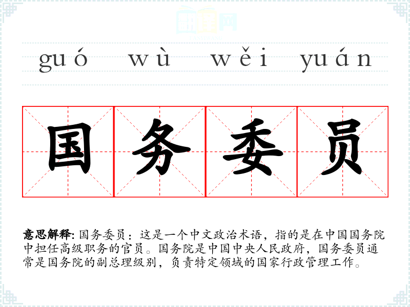 国务委员:这是一个中文政治术语,指的是在中国国务院中担任高级职务的官员。国务院是中国中央人民政府,国务委员通常是国务院的副总理级别,负责特定领域的国家行政管理工作。